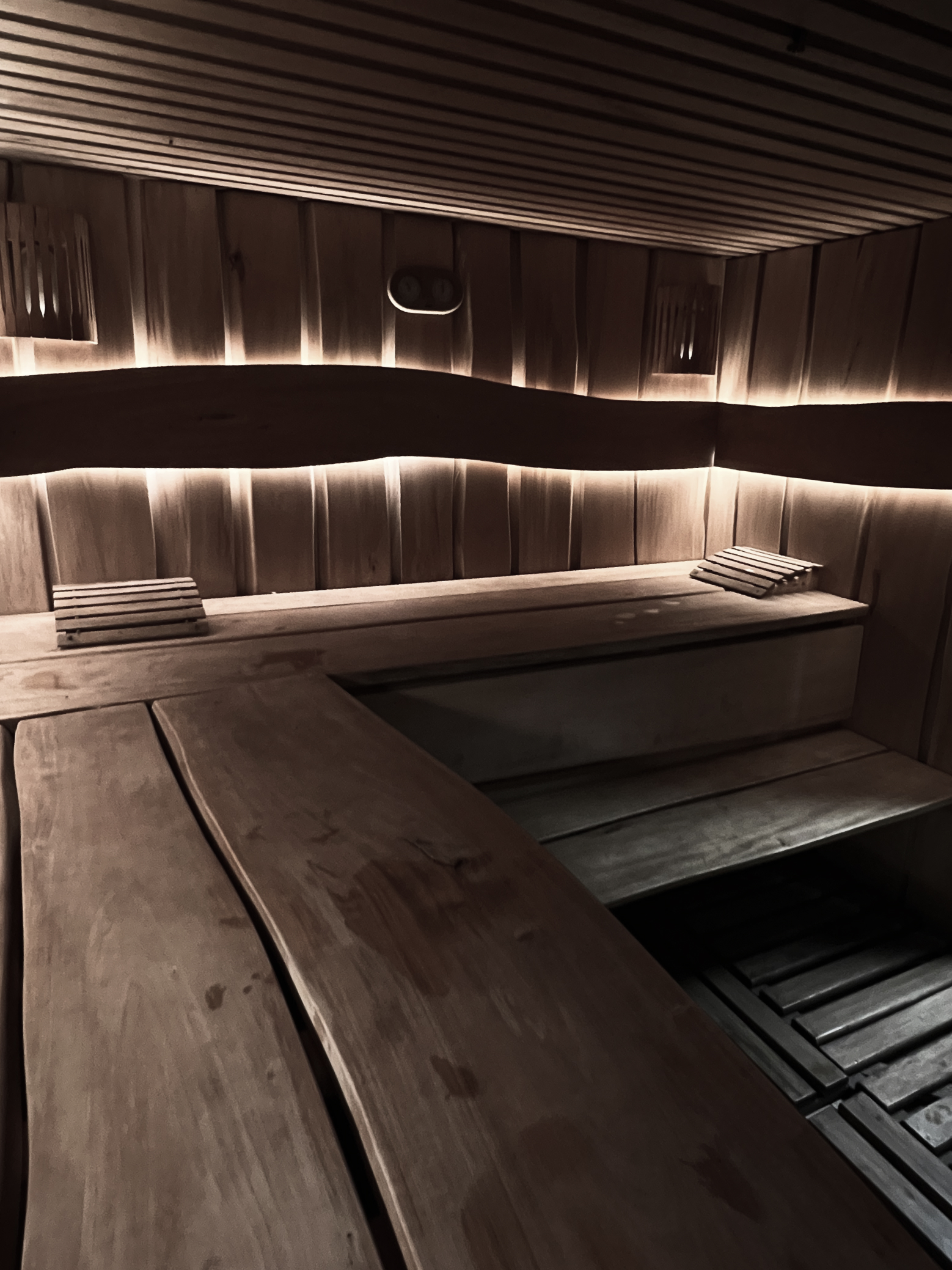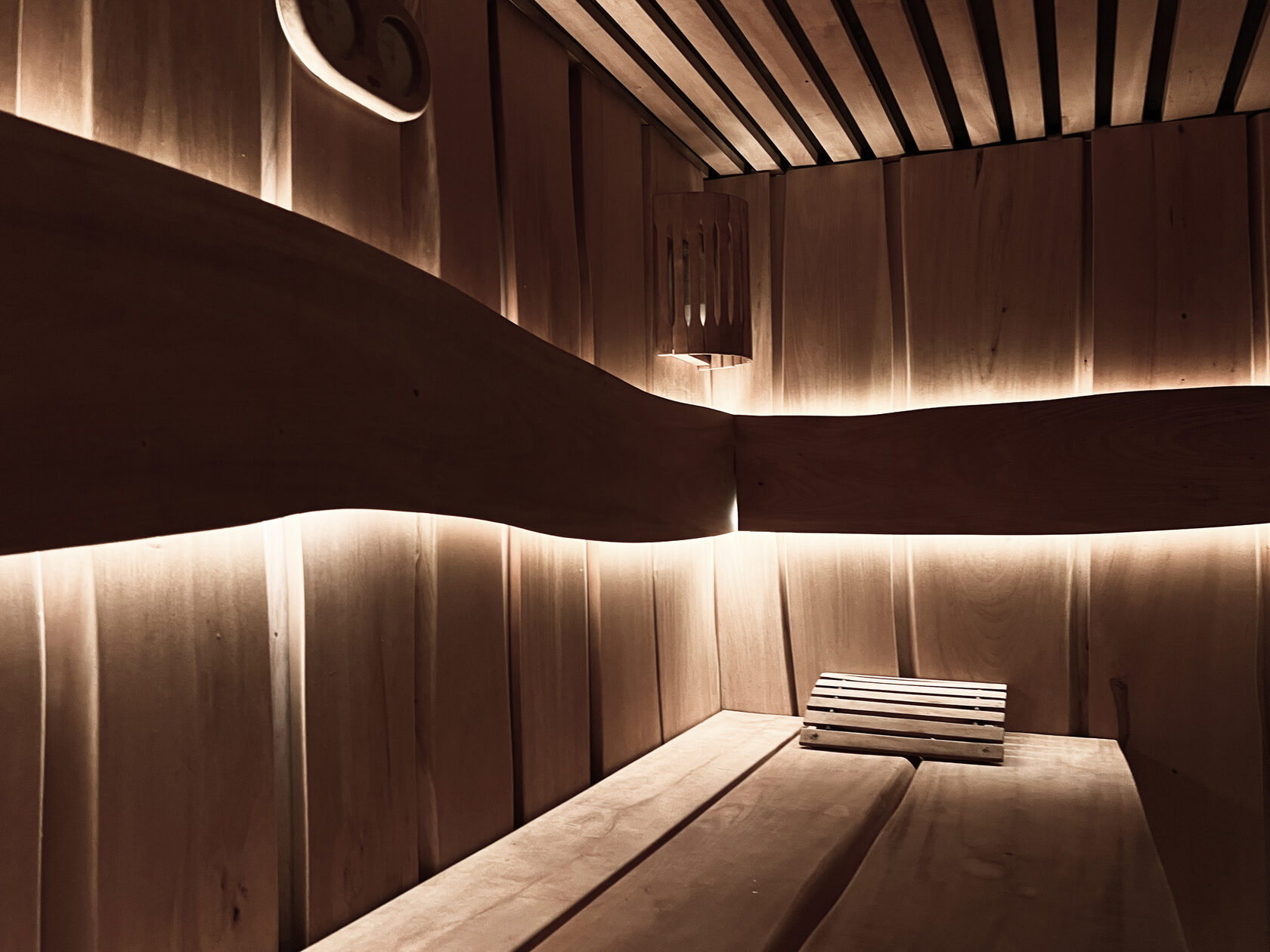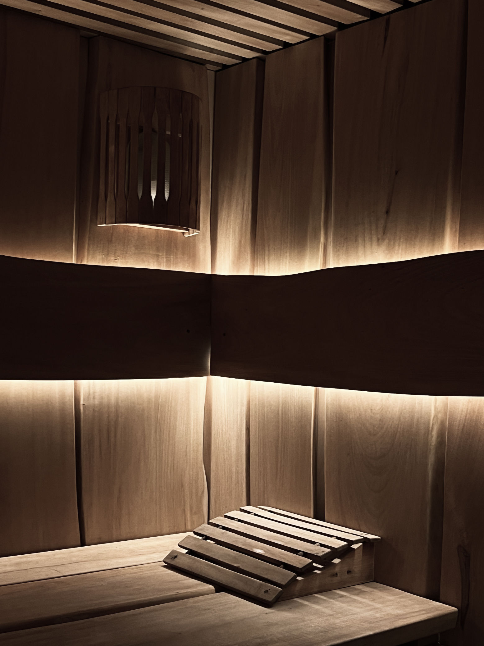 Стены облицевали специально подобранными досками из липы и ольхи, каждая из которых прошла ручную обработку до шелковистой поверхности. Никаких щелей, никаких огрехов — только идеальная текстура, приятная на ощупь. Скрытые светодиодные ленты создали эффект, будто свет исходит изнутри самого дерева. Этот прием напоминает природные явления — загадочное свечение в глубине земли или мягкий отблеск солнца на коре.