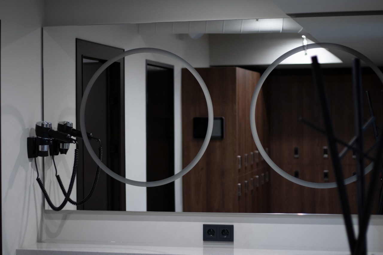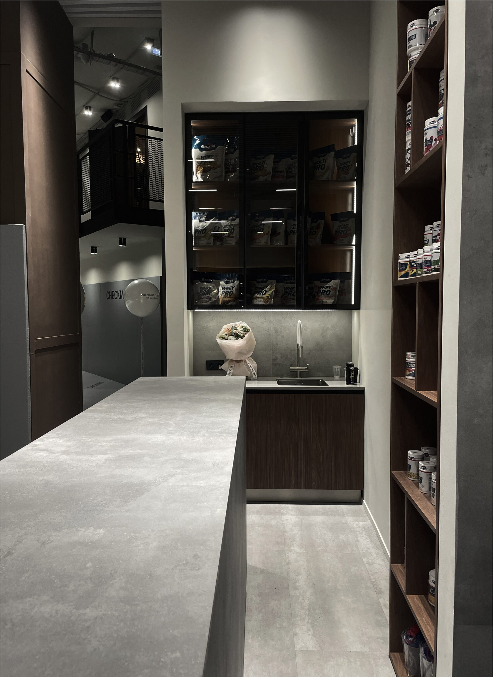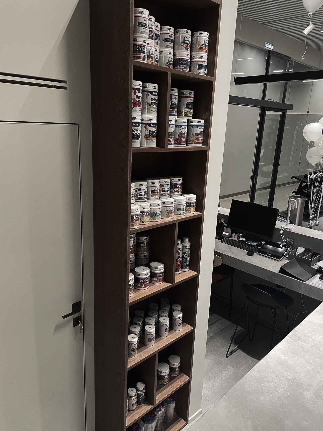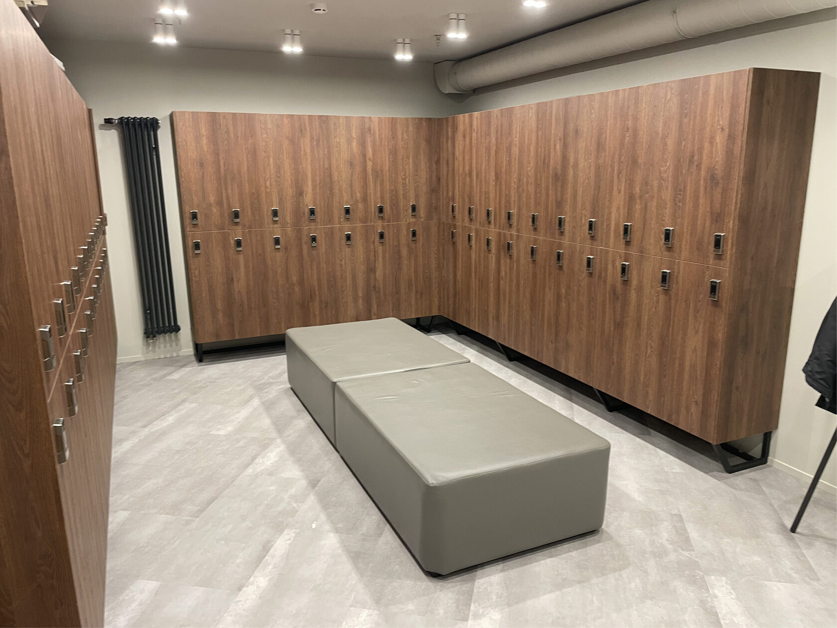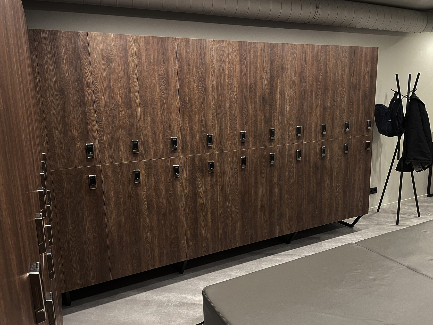 Работа началась с понимания специфики: для влажных зон выбрали панели Climaff — материал, который не деформируется от влажности и выдерживает любые нагрузки. Стойка рецепшена стала визитной карточкой клуба, ее форма напоминает удар — четкий, мощный, завершенный. В раздевалках каждый локер — произведение столярного искусства. Натуральная кожа банкетки приглашает сосредоточиться перед тренировкой.