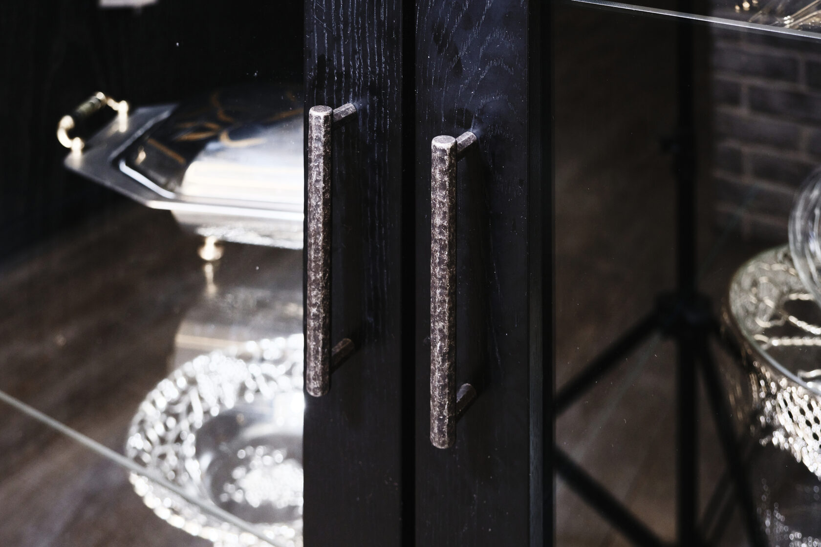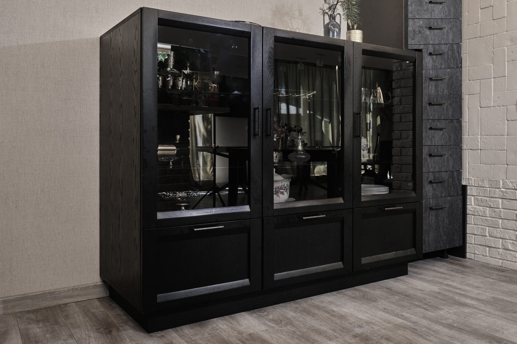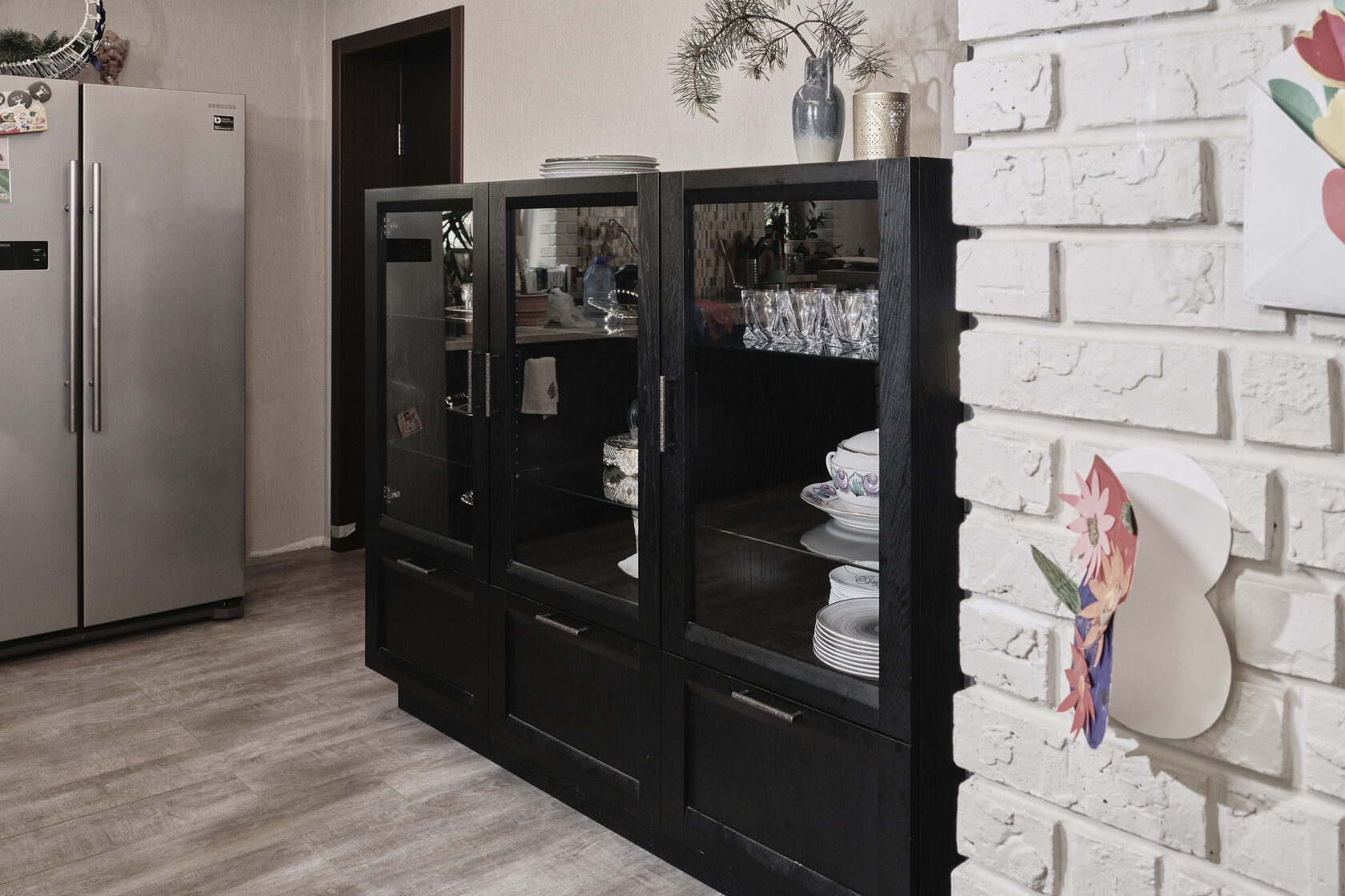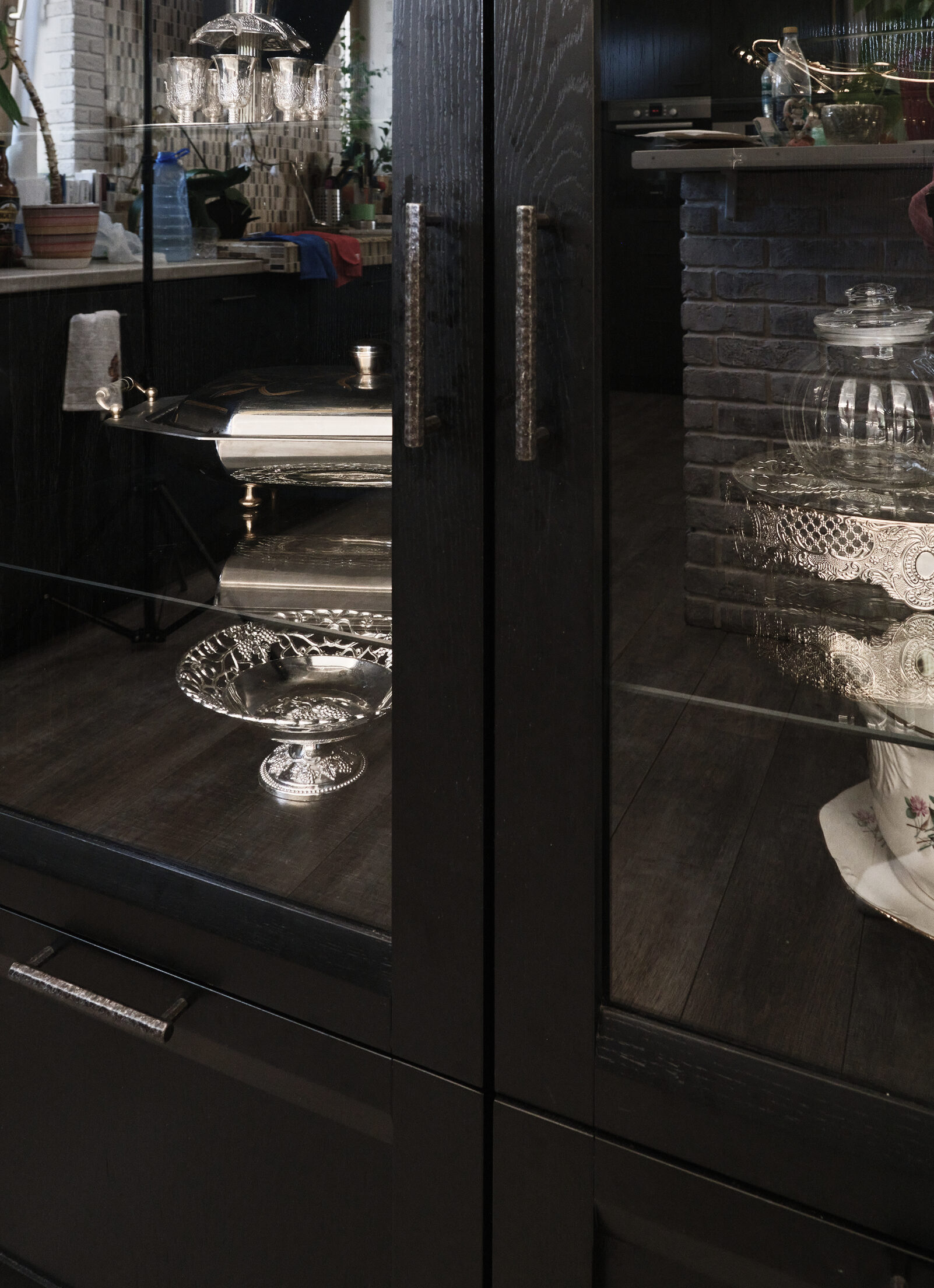 Решение нашлось в использовании стеклянных фасадов и открытых полок. Массив дуба стал основой конструкции, металлическая фурнитура с благородной патиной добавила винтажного шарма. Стеклянные дверцы позволяют видеть содержимое. Каждый член семьи может найти нужное, не переворачивая всё вверх дном. Множество рабочих поверхностей на разных уровнях позволяет нескольким людям одновременно готовить.
