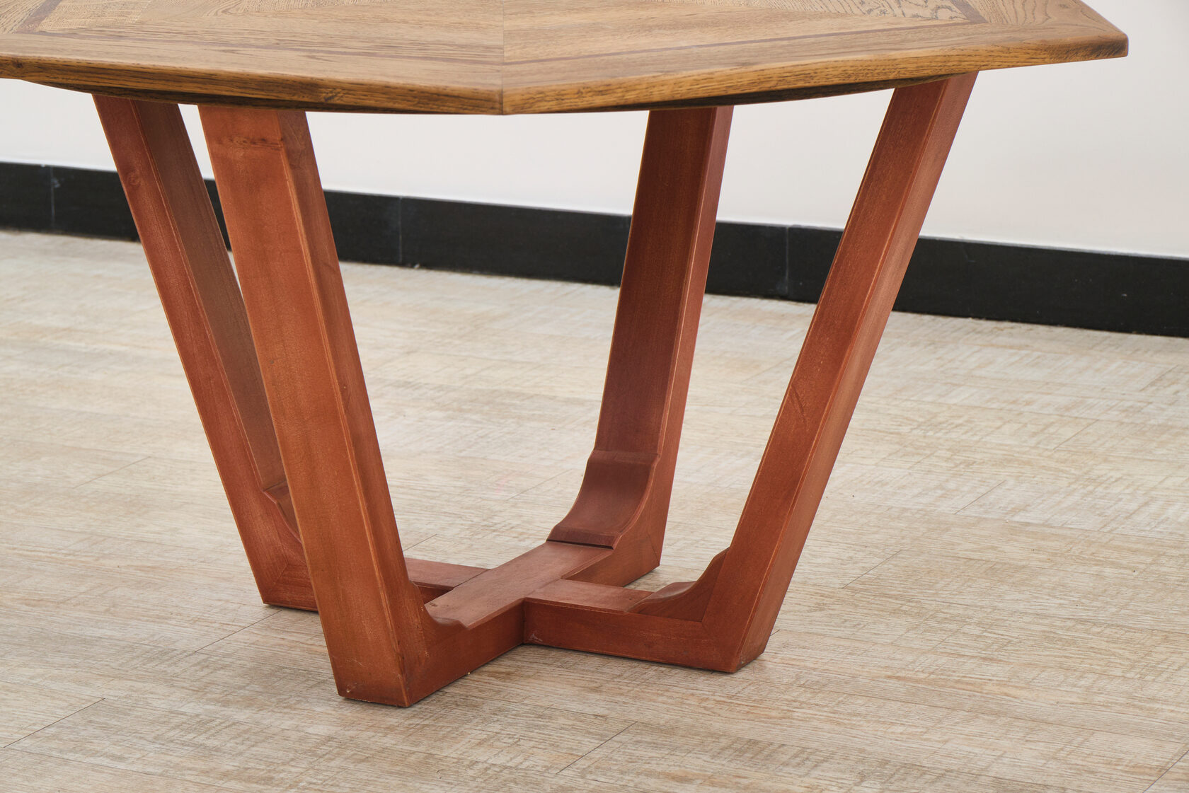 Комбинация дуба, клена и красного дерева создает сложный визуальный паттерн, где каждая порода подчеркивает красоту соседних. Техника инкрустации требует ювелирной точности и многолетнего опыта работы с деревом.