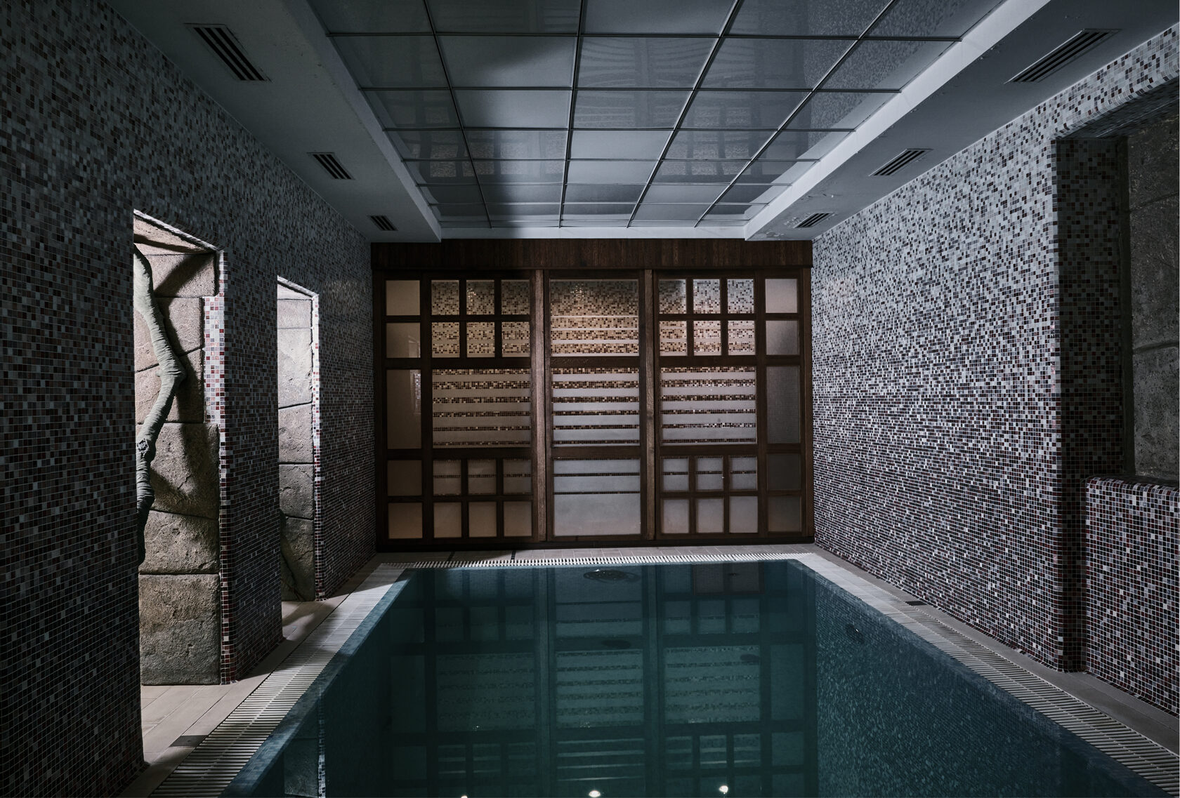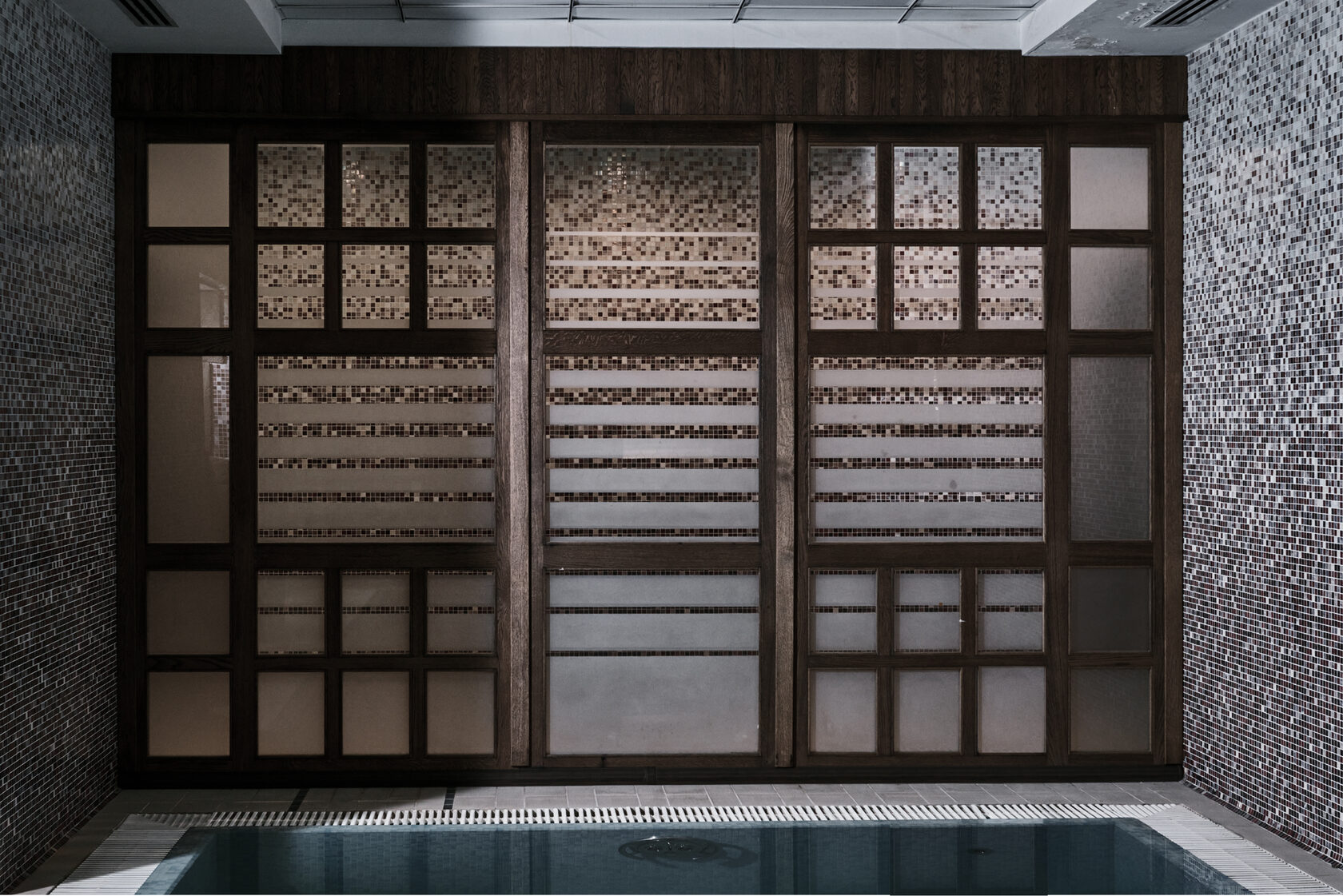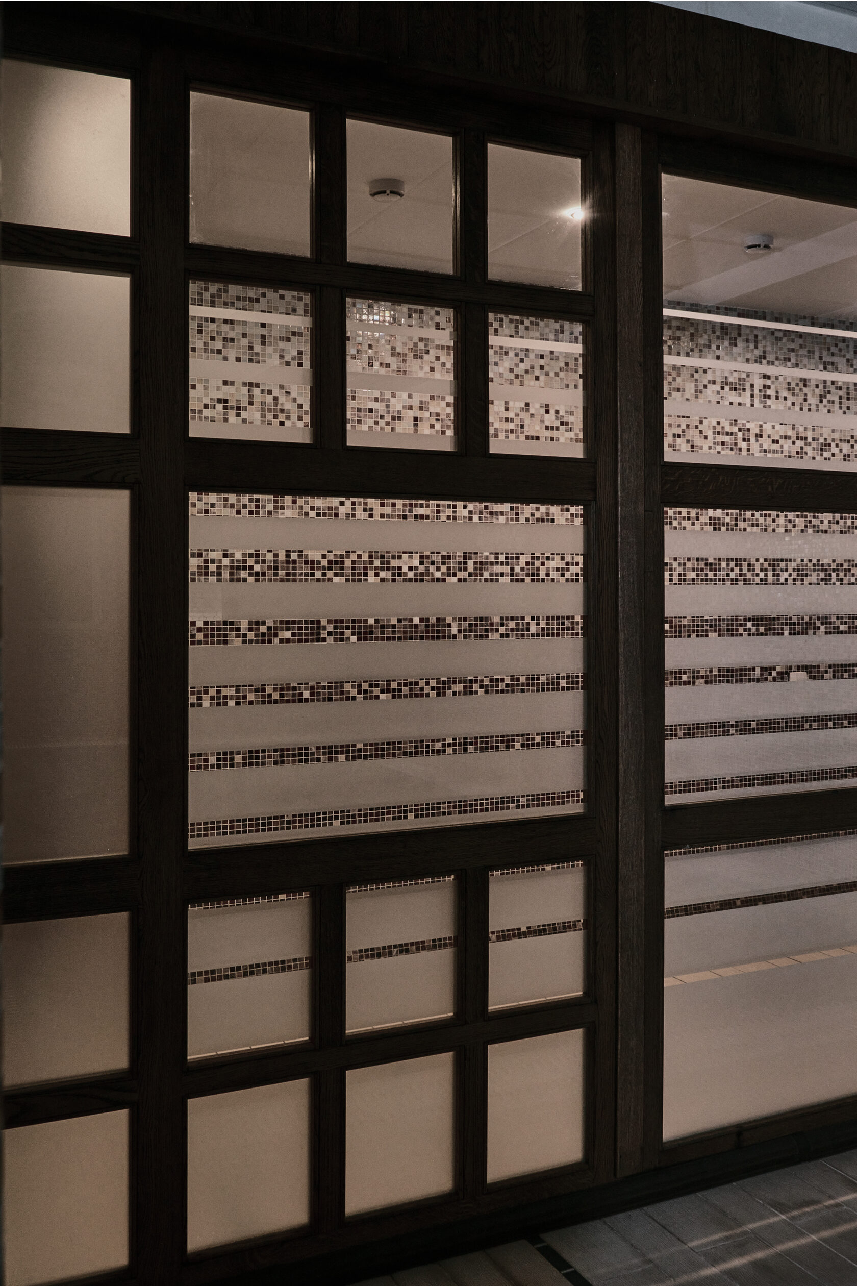 Решение родилось из понимания водной среды. Здесь важны прозрачность и текучесть. Перегородка спроектирована как симбиоз массива дуба, а также матированного стекла. Деревянный каркас создает ощущение надежности, стекло обеспечивает визуальную связь между зонами. Матирование стекла выполнено с особым рисунком, создающим игру света и тени. Солнечные лучи, проходя через перегородку, создают на воде узоры, напоминающие морскую рябь.